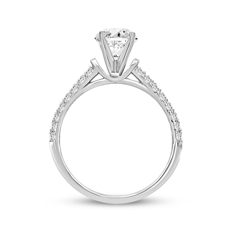 - A 1-carat round-cut diamond is the raised focal point, flanked by polished collars.