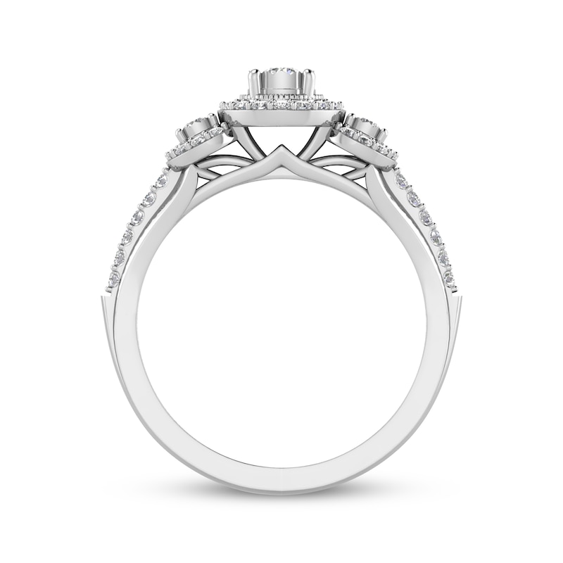 Pop the question with this shimmering three-stone engagement ring. Created in 10K white gold, the round-cut center diamond is artfully set to enhance size and sparkle. It’s wrapped in a halo frame of milgrain detailing and round diamonds. Halo-framed round diamonds flank the center stone and line the shank for a total diamond weight of 1/3 carat. From the Now & Forever® bridal collection.