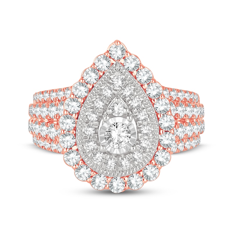 Make your proposal with this sparkling engagement ring. Crafted in 10K rose gold with white rhodium details, the design is centered with a round-cut diamond artfully set to enhance size and sparkle. Pear-shaped frames of round-cut diamonds and milgrain detailing create an impressive display. Along the tapered shank, rows of round-cut diamonds bring the total diamond weight to 1 1/2 carats. From the Now & Forever® bridal collection.