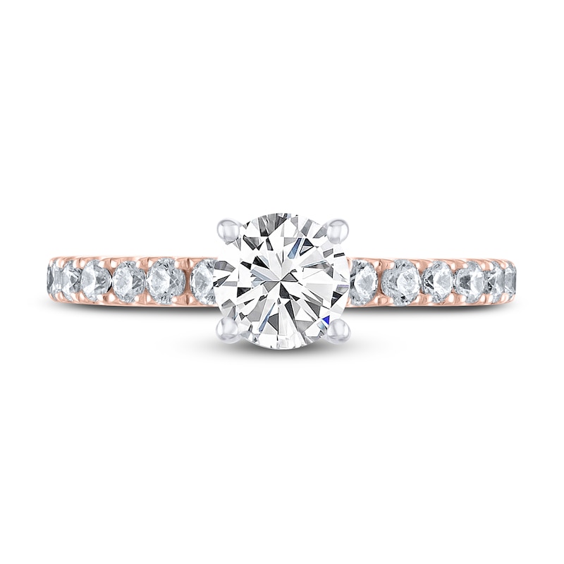 A stunning 3/4-carat round diamond sparkles in 14K white gold prongs at the center of this chic engagement ring from THE LEO Diamond® collection. Set in dreamy 14K rose gold, brilliant round diamonds sparkle down the sides of the band, bringing the total diamond weight to 1 1/8 carats. The independently certified center diamond is laser-inscribed with a unique Gemscribe® serial number to ensure your peace of mind.