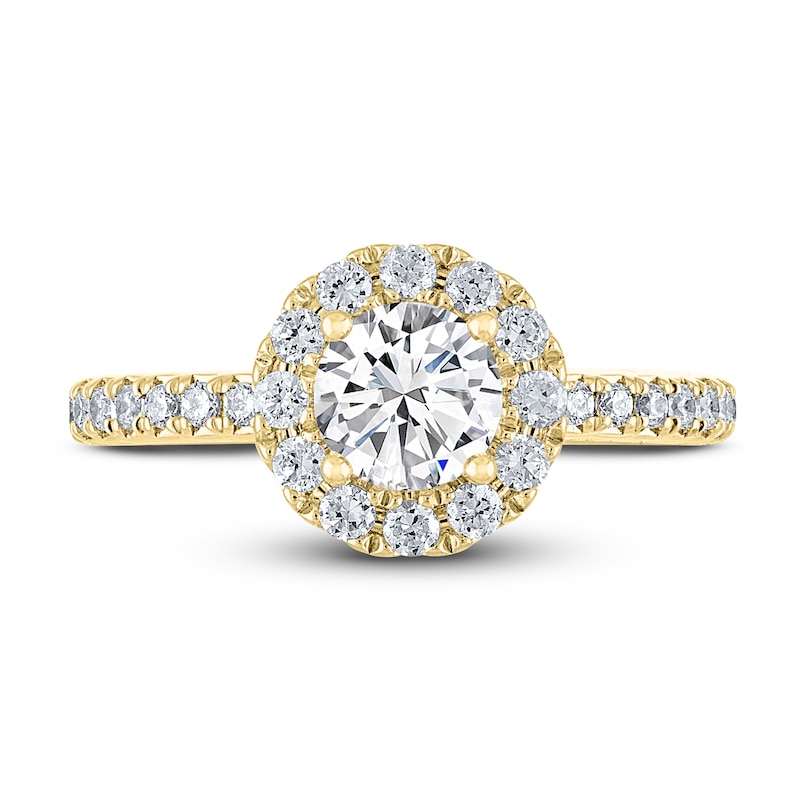 A stunning 3/4-carat round diamond sparkles at the center of this chic engagement ring from THE LEO Diamond® collection. Set in timeless 14K yellow gold, brilliant round diamonds halo the center and shimmer down the band. The ring has a total diamond weight of 1 1/8 carats. The independently certified center diamond is laser-inscribed with a unique Gemscribe® serial number to ensure your peace of mind.