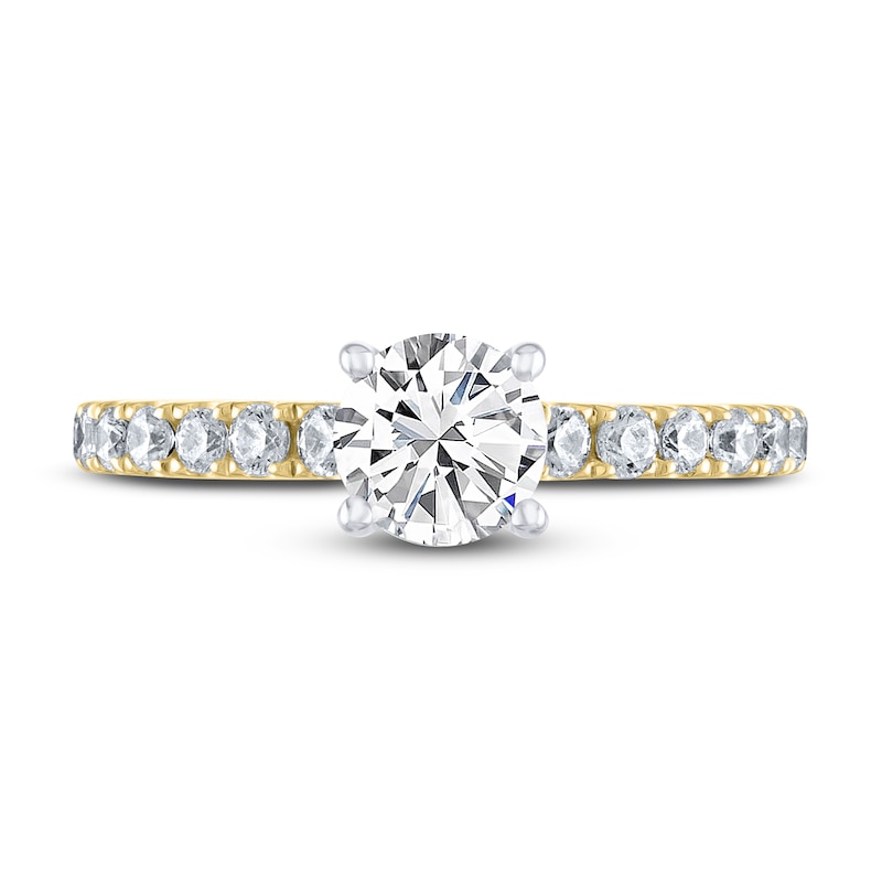This stunning engagement ring from THE LEO Diamond® collection showcases a 3/4-carat brilliant round diamond at its center, set in beautiful 14K white gold prongs. The 14K yellow gold band sparkles with more independently-certified round-cut diamonds, giving the ring a total diamond weight of 1 1/8 carats. The independently certified center diamond is laser-inscribed with a unique Gemscribe® serial number to ensure your peace of mind.