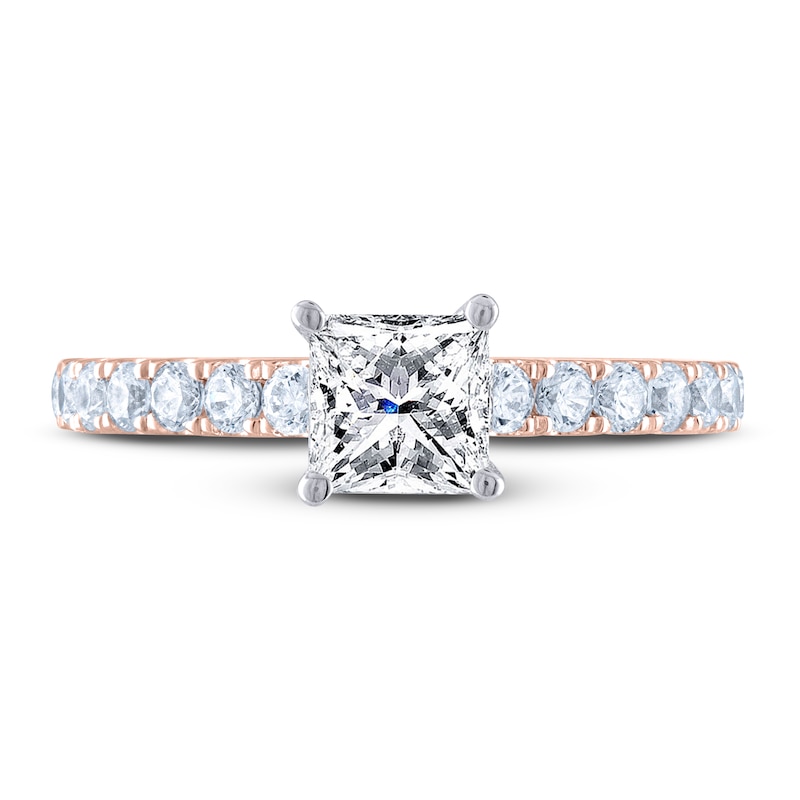 A gorgeous 1-carat princess-cut diamond sparkles in 14K white gold prongs at the center of this chic engagement ring from THE LEO Diamond® collection. Brilliant round diamonds sparkle down the 14K rose gold band, giving the ring a total diamond weight of 1 3/8 carats. The independently certified center diamond is laser-inscribed with a unique Gemscribe® serial number to ensure your peace of mind.