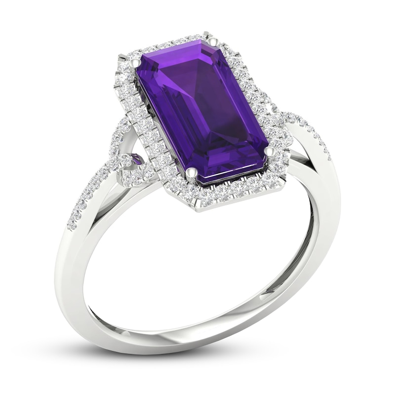 An exquisite emerald-cut amethyst glimmers at the center of this beautiful ring for her. Sparkling round-cut diamonds halo the center, and more shimmer down the 10K white gold band for a total diamond weight of 1/5 carat.
