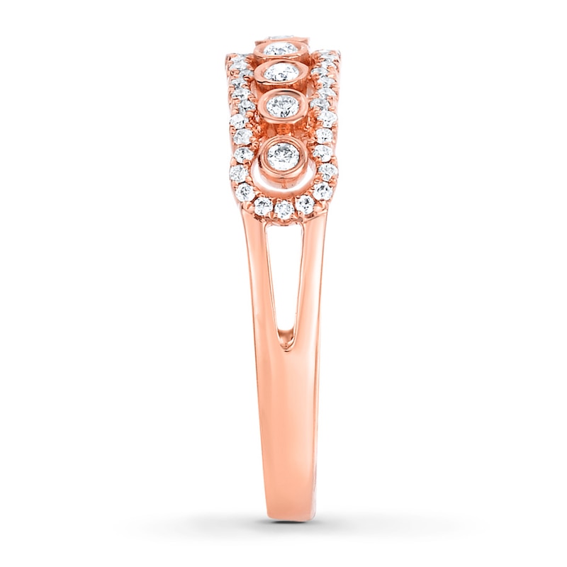 Beautiful diamonds set in 10K rose gold form the center of this elegant ring for her, while rows of more diamonds decorate the scalloped edges. The breathtaking ring totals 1/3 carat in diamonds.