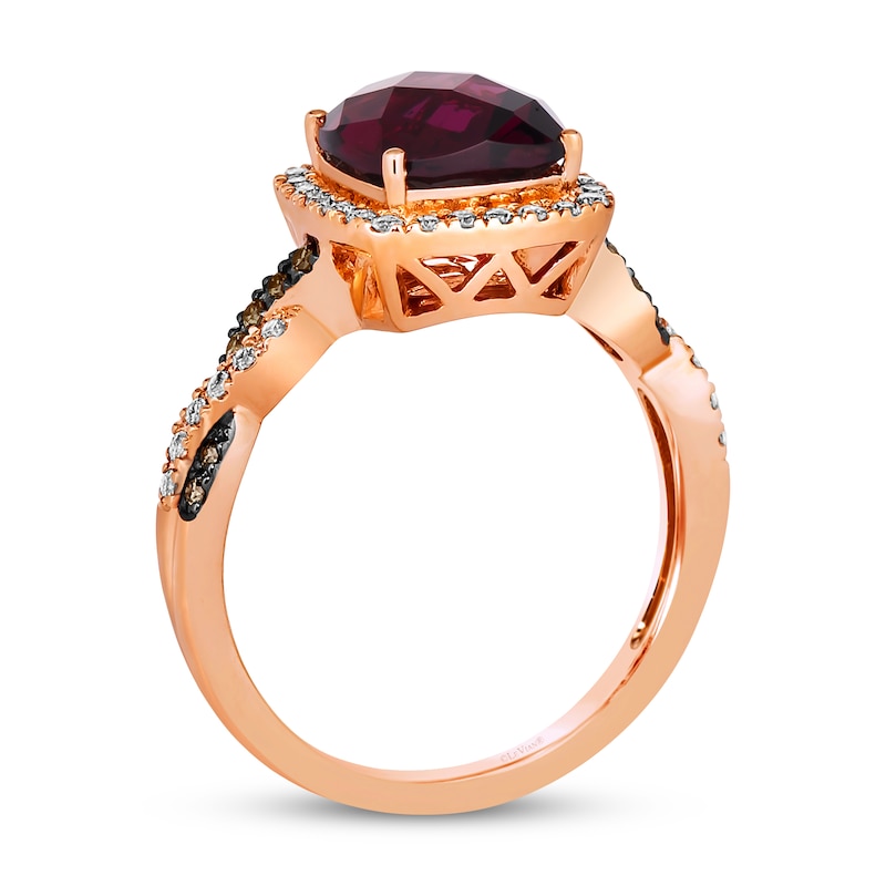 This irresistible Le Vian® ring from the KAY exclusive Chocolate Twist™ collection displays a succulent cushion-cut Raspberry Rhodolite® garnet. Round Nude Diamonds™ surround the center and sparkle along the band, interweaving with a twisting ribbon of round rich Chocolate Diamonds®. The ring is crafted in sweet 14K Strawberry Gold® and has a total diamond weight of 1/3 carat. Le Vian®. Discover the Legend. This ring is available in limited sizes. If you don't see your size here, please visit a store to order your ring.