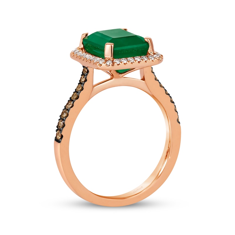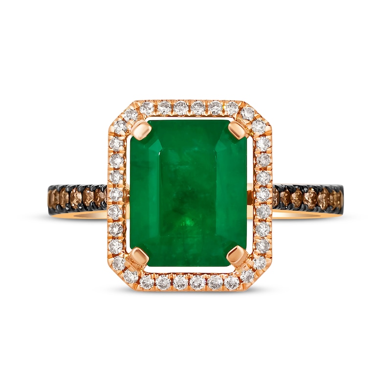 Bring natural tones to your look with the tempting style of this ring from Le Vian®. Crafted in 14K Strawberry Gold®, the decadent design showcases an emerald-cut Costa Smeralda Emeralds™ stone wrapped in an octagon-shaped halo of round-cut Nude Diamonds™. Round-cut Chocolate Diamonds® line the slender shank, bringing the total diamond weight to 3/8 carat. Le Vian®. Discover the Legend. This ring is available in limited sizes. If you don't see your size here, please visit a store to order your ring.