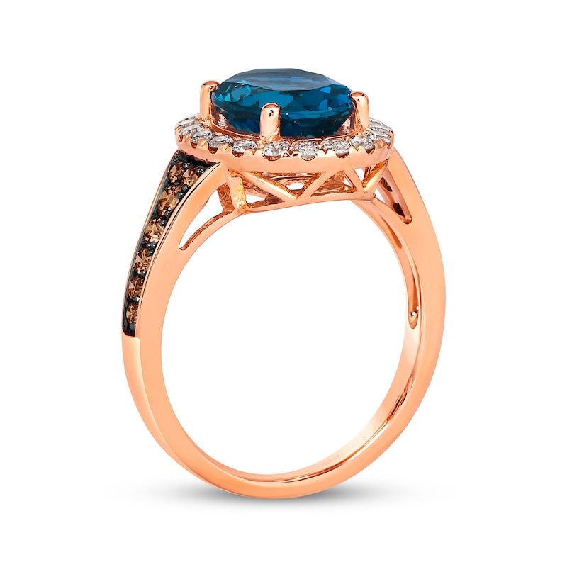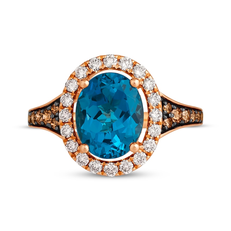 Wrap their finger in the luxe look of this delicious ring from Le Vian®. Created in 14K Strawberry Gold®, the design features an oval-cut Deep Sea Blue Topaz™ wrapped in a halo frame of round-cut Nude Diamonds™. Round-cut Chocolate Diamonds® line the shank, bringing the total diamond weight to 5/8 carat. Le Vian®. Discover the Legend. This ring is available in limited sizes. If you don't see your size here, please visit a store to order your ring.