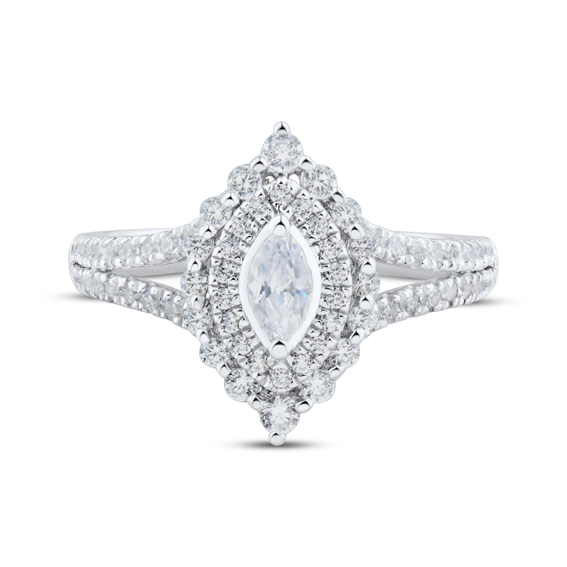 Ask the big question with this stunning engagement ring. Created in 14K white gold, the ring is centered with a dazzling 1/5-carat marquise-cut diamond and wrapped in a decorative frame of shimmering round-cut diamonds. More round-cut diamonds decorate the gallery and line the split shank for a total diamond weight of 3/4 carat. From the Now & Forever® bridal collection