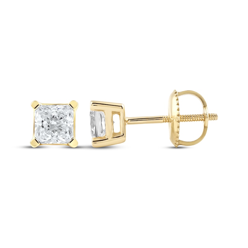 Stunning in their simplicity, these regal earrings showcase exquisite princess-cut lab-created diamonds, each independently certified and laser-inscribed with a unique Gemscribe® serial number to ensure your peace of mind. Crafted in 14K yellow gold, these post earrings have a total lab-created diamond weight of 3/4 carat and safely secure with screw backs. From the Lab-Created Diamonds by KAY collection.