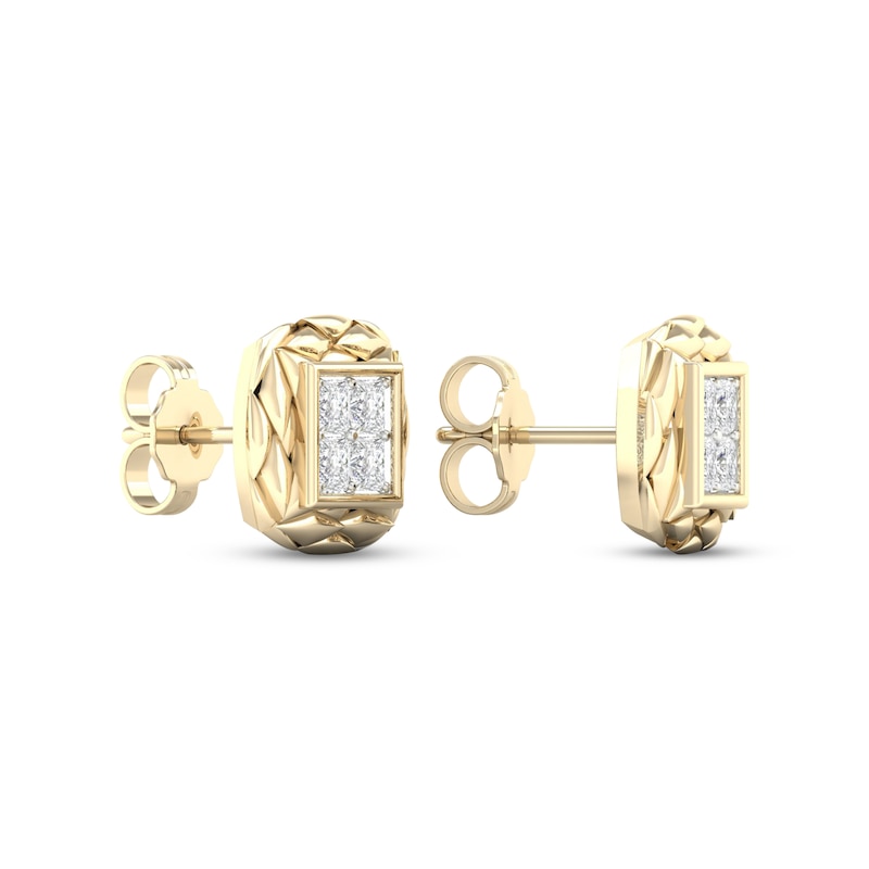 Add intrigue to your look with these eye-catching gender neutral cushion earrings. A quartet of glittering square-cut diamonds is the shining center of attention, framed by unique quilted texturing. Crafted in 10K yellow gold with white rhodium, the pair has a total diamond weight of 1/2 carat. The earrings secure with friction backs.