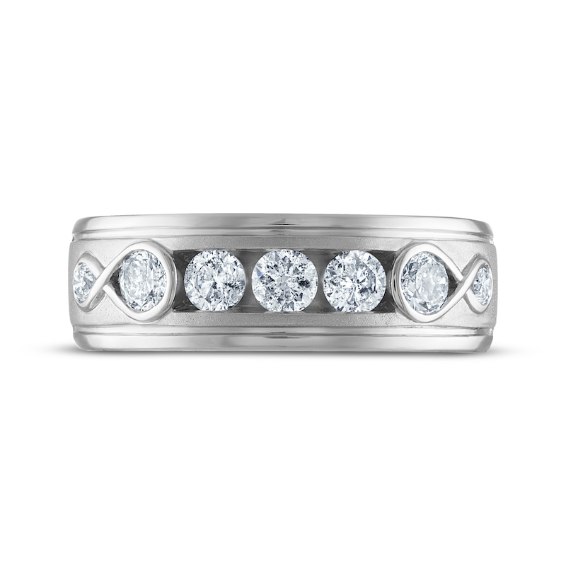 Celebrate this moment and every moment to come with diamonds for the memories you've shared and infinity designs for your endless love. This stunning wedding band is made for the big day. A trio of channel-set round-cut diamonds shines at the center, while additional round diamonds shimmer amid infinity symbols on the band. The 14K white gold ring features a satin-textured finish between polished borders and has a total diamond weight of 1 carat. A bezel-set round diamond and infinity symbol inside the shank is a signature of the Every Moment collection, exclusively at KAY.