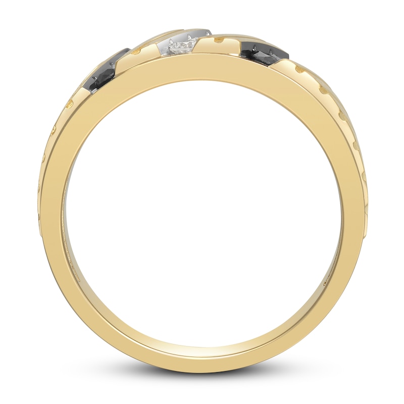 This striking men's wedding band features three diagonal rows of gorgeous round-cut white and black diamonds. The white diamonds are set in a white rhodium flash, and the black diamonds are set in a black rhodium flash for a stunning look. The satin-finished 10K yellow gold band boasts a textured design and a total diamond weight of 1/2 carat. From the Now & Forever®collection.