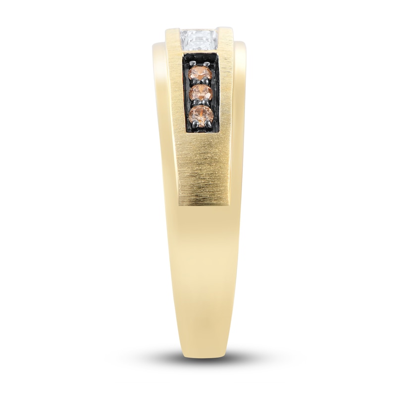 This sleek and stylish men's wedding band features a channel-set row of sparkling round-cut white diamonds flanked on either side by rich round-cut brown diamonds. Rhodium contrast details and a brushed finish on the 10K yellow gold complete the striking look. The ring has a total diamond weight of 1/4 carat. From the Now and Forever® collection.