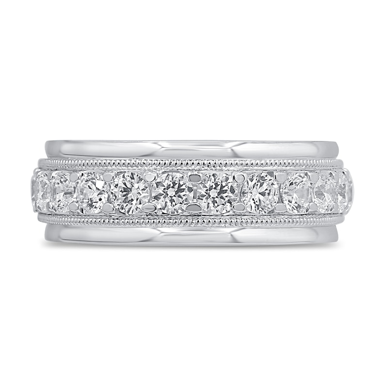 A row of brilliant round-cut diamonds sparkle across this men's diamond wedding band, giving the ring a total diamond weight of 1 1/2 carats. The ring is fashioned in sleek 10K white gold and finished with classic milgrain detailing. From the Now & Forever® collection.