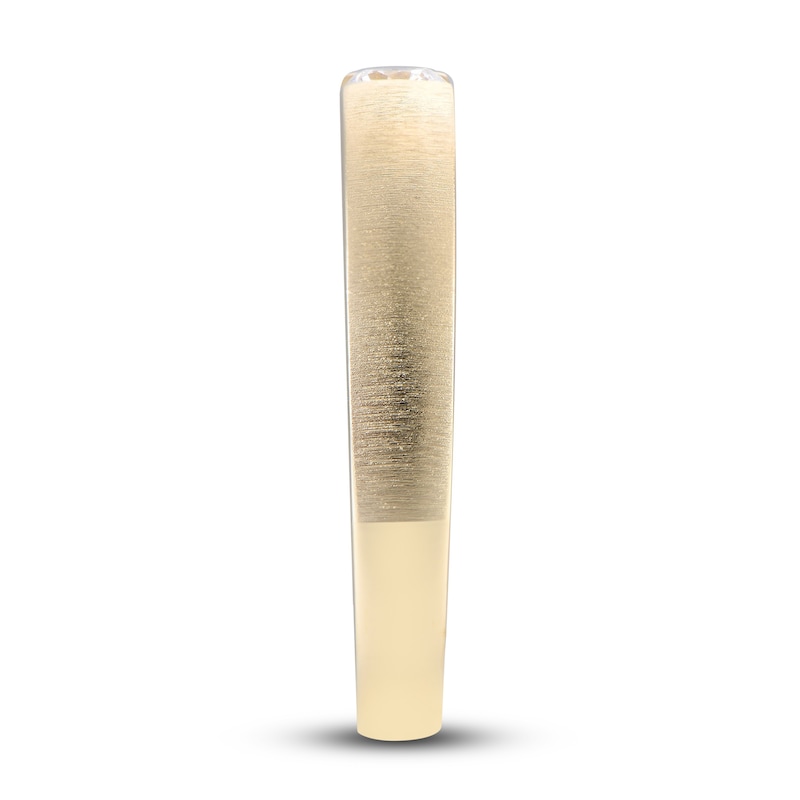A dignified and meaningful symbol of your love, this men's wedding band displays a sparkling round-cut diamond at the center. The 10K yellow gold band features a brushed finish and has a total diamond weight of 1/5 carat. From the Now and Forever® collection.
