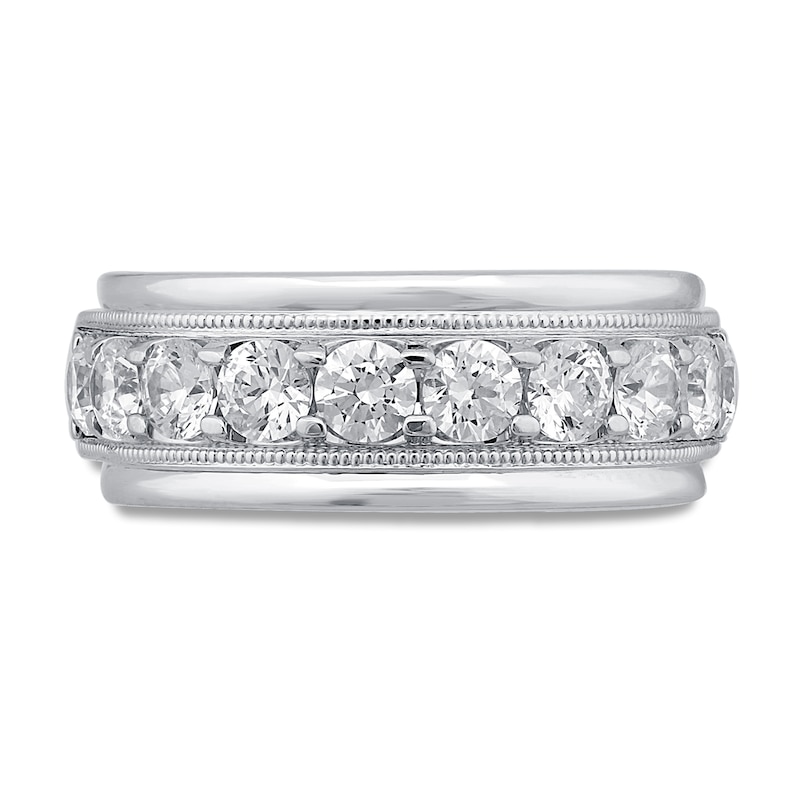 A row of brilliant round-cut diamonds sparkle across this men's diamond wedding band, giving the ring a total diamond weight of 2 carats. The ring is fashioned in sleek 10K white gold and finished with classic milgrain detailing. From the Now & Forever® collection.
