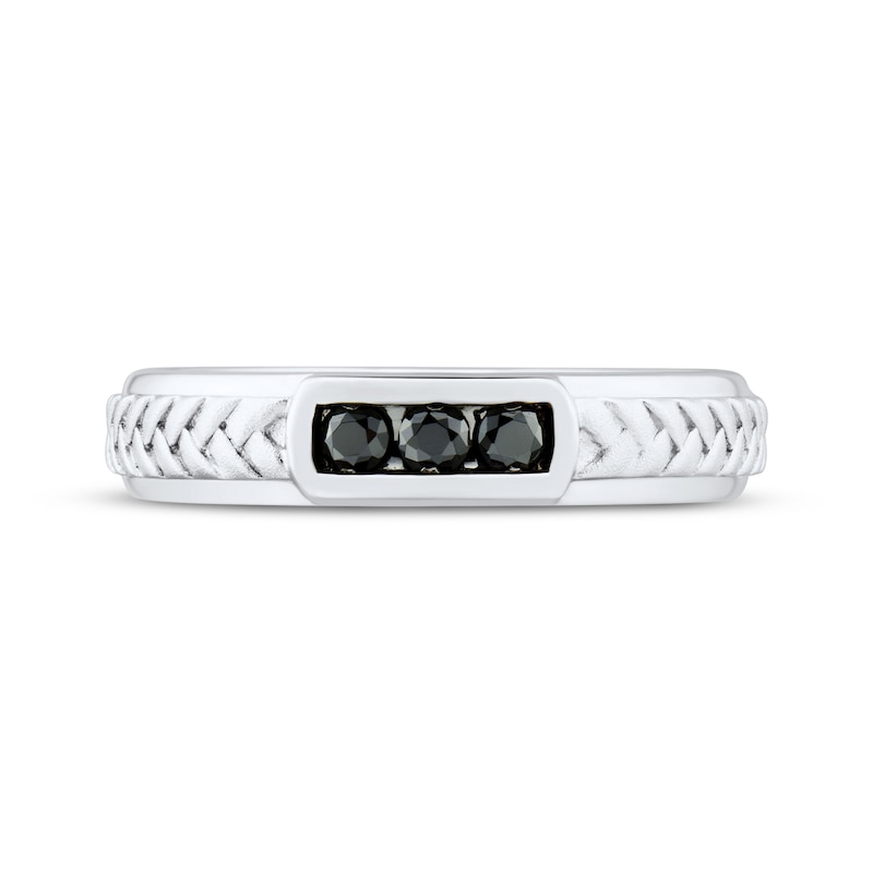 They’ll love the look of this black diamond anniversary band. Crafted in 10K white gold, the braided sandblasted texture gives way to a polished channel that showcases a trio of round-cut black diamonds. This ring has a total diamond weight of 1/4 carat. From the Now & Forever® collection.