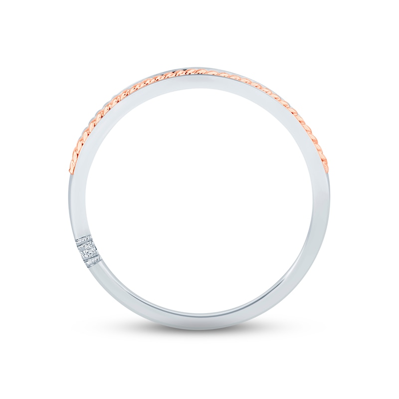 With its complementary combination of 18K white gold and 18K rose gold frames, this band radiates striking contrast. A row of channel-set round-cut diamonds is featured in the eye-catching center. A signature element of diamonds encircles the ring, symbolizing unity and eternal love. The independently certified diamonds total 1/2 carat in weight. From the Monique Lhuillier Bliss collection, available exclusively at KAY. Please note: This ring is available in limited sizes. If you don't see your size here, please visit a store to order your ring.