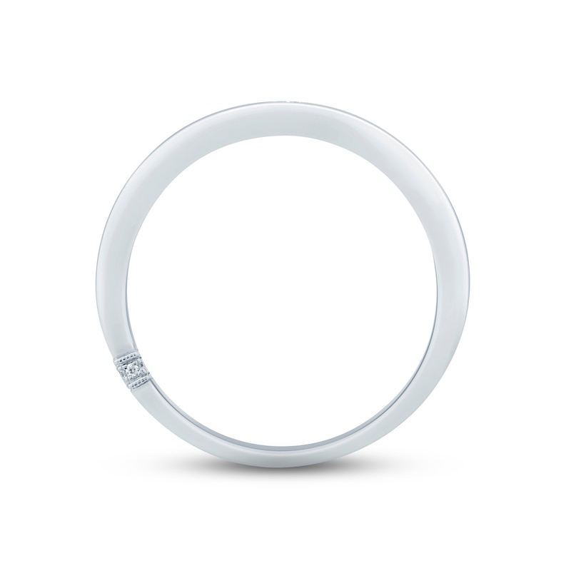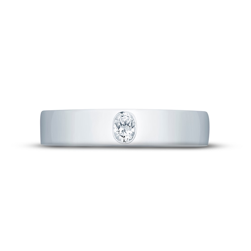 This distinguished wedding band is crafted in 18K white gold and features a magnificent oval-cut diamond bezel-set in the center. A signature element of diamonds encircles the ring, symbolizing unity and eternal love. The independently certified diamonds total 1/4 carat in weight. From the Monique Lhuillier Bliss collection, available exclusively at KAY. Please note: This ring is available in limited sizes. If you don't see your size here, please visit a store to order your ring.