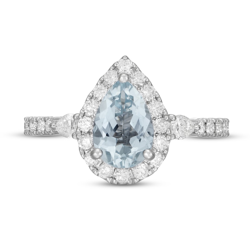 A pear-shaped aquamarine adds a splash of color to this stunning engagement ring for her. Brilliant round diamonds surround the center and adorn the band. This ring is crafted in 14K white gold and has a total diamond weight of 7/8 carat. From the Neil Lane Bridal® collection.