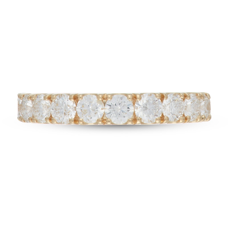 A beautiful complement to a Neil Lane Bridal® engagement ring or wedding band (sold separately), this incredible anniversary band showcases brilliant round diamonds totaling 1 1/2 carats in weight. Milgrain beading lines the inner edge of the 14K yellow gold band for the finishing touch.