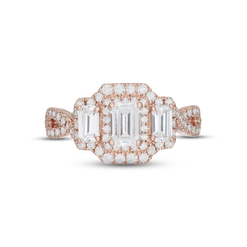Inspired by Art Deco design, this extraordinary engagement ring from Neil Lane Bridal® features three breathtaking, emerald-cut diamonds. Sparkling round diamonds halo the center and sweep along the 14K rose gold band, bringing the total diamond weight to 1 1/2 carats.
