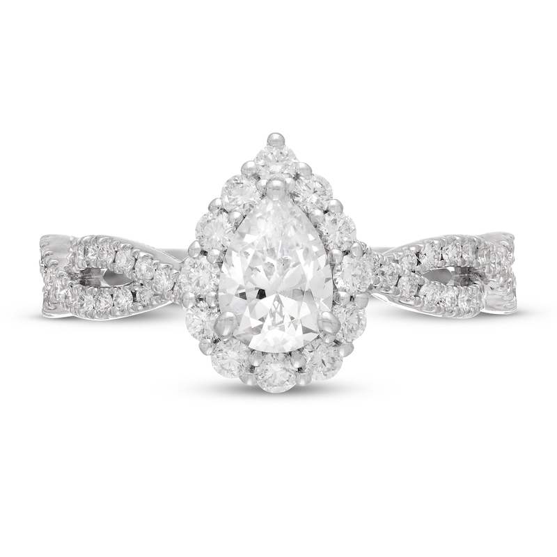 This magnificent engagement ring from the Neil Lane Bridal® collection features a stunning 3/4 carat pear-shaped diamond at its center, haloed by brilliant round diamonds. More round diamonds swirl down each side of the twisted 14K white gold band for a total diamond weight of 1 1/4 carats. Subtle milgrain detailing completes the classic look.