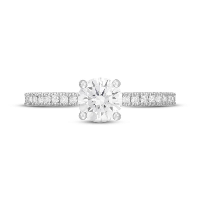 A scintillating 1-carat round diamond sparkles at the center of this gorgeous engagement ring for her. Styled in 14K white gold, shimmering round diamonds sweep down the band for a total diamond weight of 1 1/4 carats. Delicate milgrain detailing finishes the look. From the Neil Lane Bridal® collection.