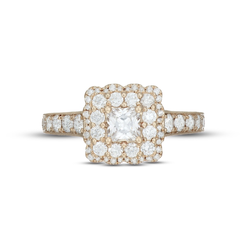 This incredible engagement ring from Neil Lane Bridal® is a testament to Hollywood glamour and vintage-inspired elegance. The center showcases a 1/2-carat princess-cut diamond haloed by shining round diamonds. The band is adorned with more round diamonds, while milgrain detail adds subtle texture. A flourishing design is carved into the side for the finishing touch. Crafted of 14K yellow gold, the ring has a total diamond weight of 1 3/8 carats.