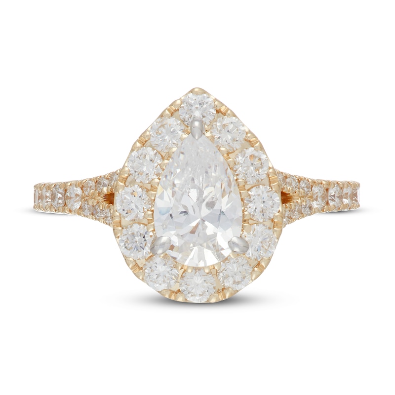 This eye-catching Neil Lane Bridal® engagement ring for her features a stunning 1 carat pear-shaped diamond at its center set by 14K white gold prongs and haloed by brilliant round diamonds. More round diamonds line each side of the band for a total diamond weight of 1 7/8 carats. The ring is fashioned in romantic 14K yellow gold and features subtle milgrain detailing for a classic look.