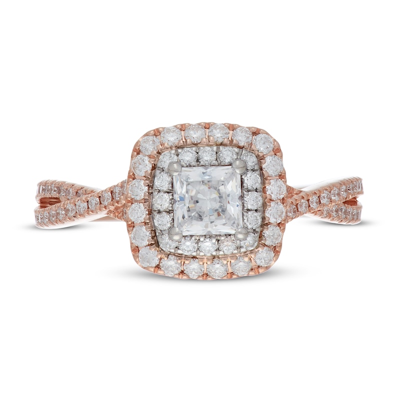 Jewelry designer Neil Lane creates elegant styles that speak to any bride, no matter her style. This enchanting Neil Lane Bridal® engagement ring displays a brilliant 1/2 carat princess-cut center diamond wrapped in haloes of round diamonds. Graceful, sparkling twists of more round diamonds form the band to complete the look. Milgrain detail adds the finishing touch. Styled in 14K two-tone rose and white gold, the ring has a total diamond weight of 1 carat.