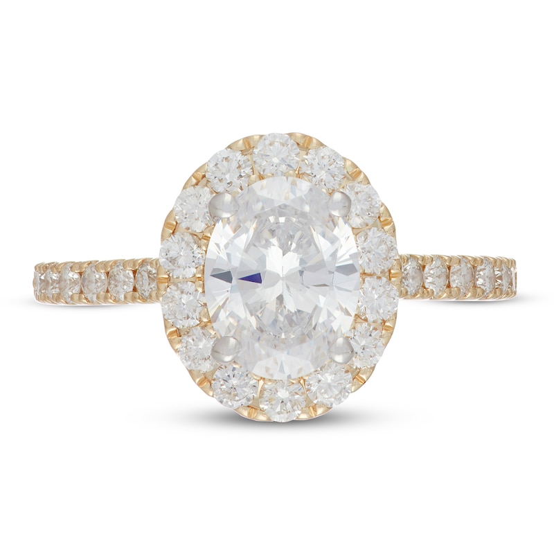 This classic engagement ring for her features a stunning 1 1/2 carat oval-shaped diamond at its center set by chic 14K white gold prongs and haloed by dazzling round diamonds. More round diamonds line each side of the band for a total diamond weight of 2 1/8 carats. The ring is fashioned in 14K yellow gold. From the Neil Lane Bridal® collection.