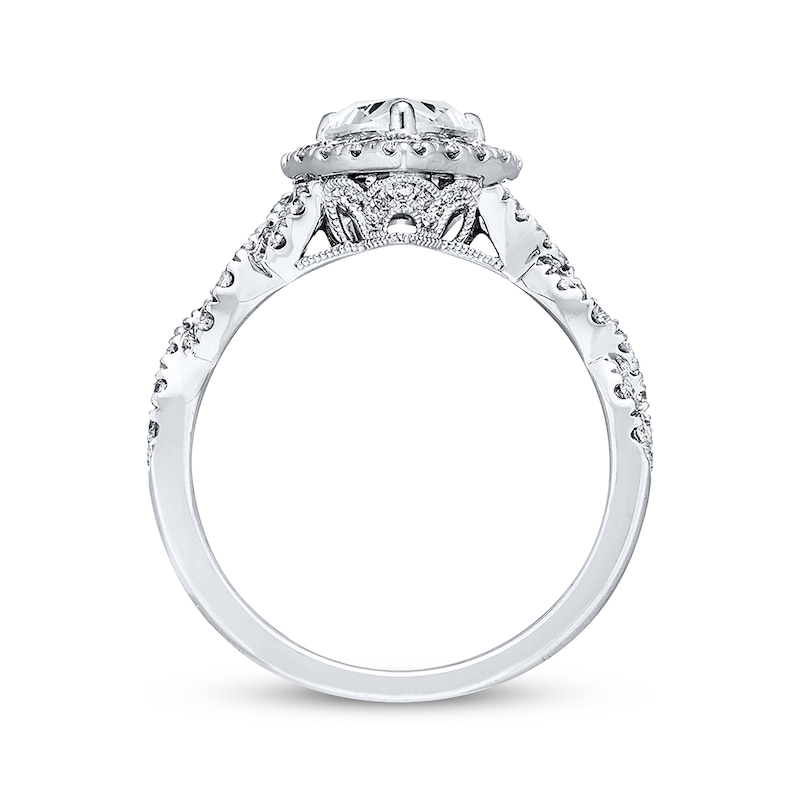 Inspired by vintage design, this sensational engagement ring from Neil Lane Studio displays a dazzling 1 1/2-carat pear-shaped diamond. Brilliant round diamonds surround the center and gently twist along the band to complement. Styled in polished 14K white gold, the ring has a total diamond weight of 2 1/8 carats.