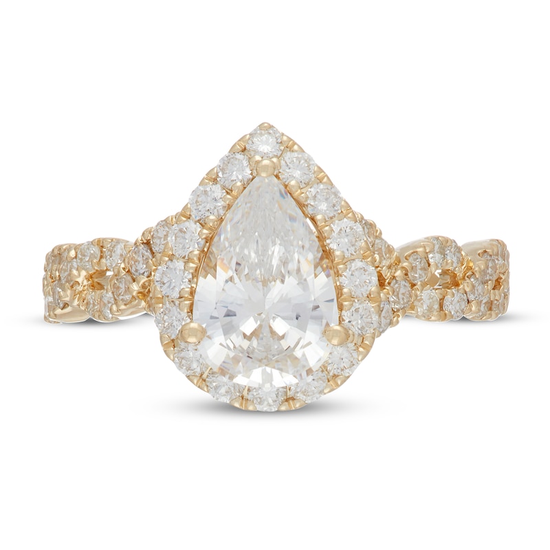 This elegant ring from the Neil Lane Bridal®collection features a dazzling 1 1/2 carat pear-shaped diamond at its center, haloed by bright round diamonds. More round diamonds line each side of the twisted band for a total diamond weight of 2 1/8 carats. The ring is fashioned in 14K yellow gold.