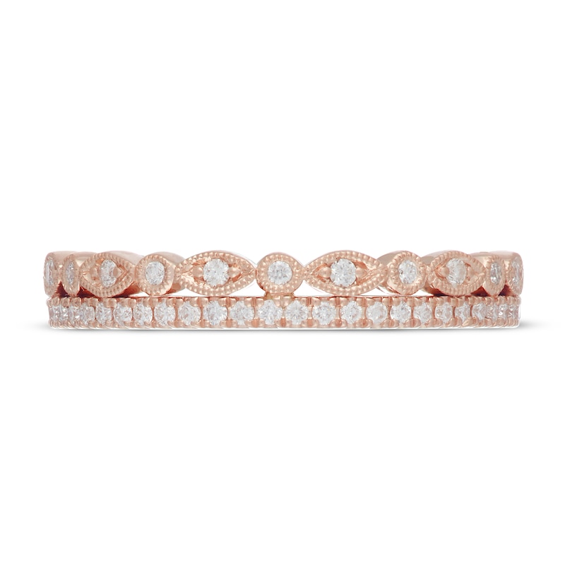 This stunning women's wedding ring, from the Neil Lane Bridal® collection, features a two-in-one look for a unique and dazzling band. The 14K rose gold band is meant to pair with her matching engagement ring (sold separately). The ring features two rows of round-cut diamonds, and the top row boasting a milgrain-detailed alternating pattern. The bottom row features a classic row of diamonds, giving the ring a total diamond weight of 1/4 carat.