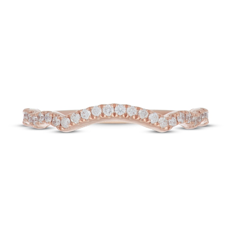 A beautiful waved design set in dreamy 14K rose gold is met with brilliant round diamonds in this stunning wedding band for her. Classic milgrain detailing finishes the look, and the ring has a total diamond weight of 1/4 carat. From the Neil Lane Bridal® collection and crafted to pair with her matching engagement ring (sold separately).