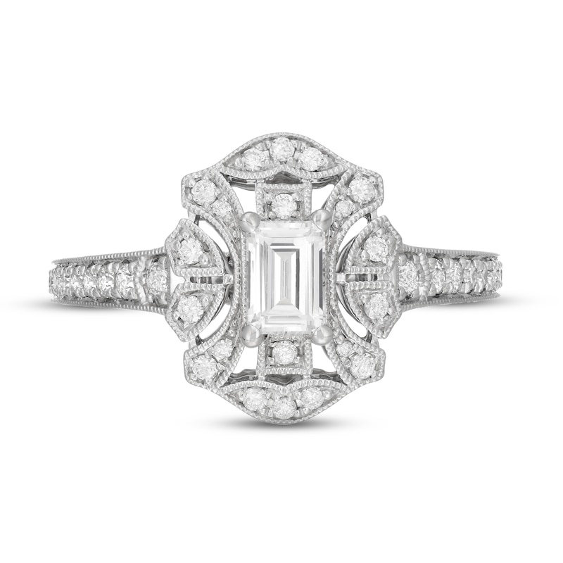 This opulent vintage-inspired engagement ring from Neil Lane Bridal® showcases a dazzling 1/3-carat emerald-cut diamond accentuated by stunning openwork details. Classic milgrain accents and radiant round diamonds add extra allure to the lustrous 14K white gold band. More round diamonds dance along the bridge, bringing the total diamond weight to 5/8 carat.