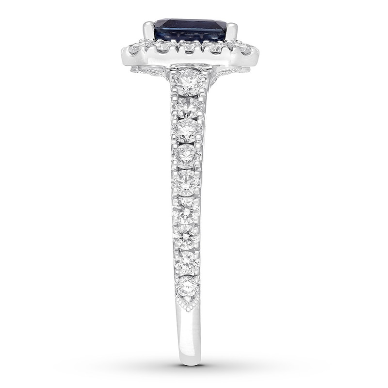 Jewelry designer Neil Lane drew inspiration from Art Deco designs to create this unforgettable engagement ring. Dazzling round diamonds play a supporting role to the stunning emerald-cut natural sapphire center. Fashioned in 14K white gold, the ring has a total diamond weight of 1 carat. From the Neil Lane™ collection.
