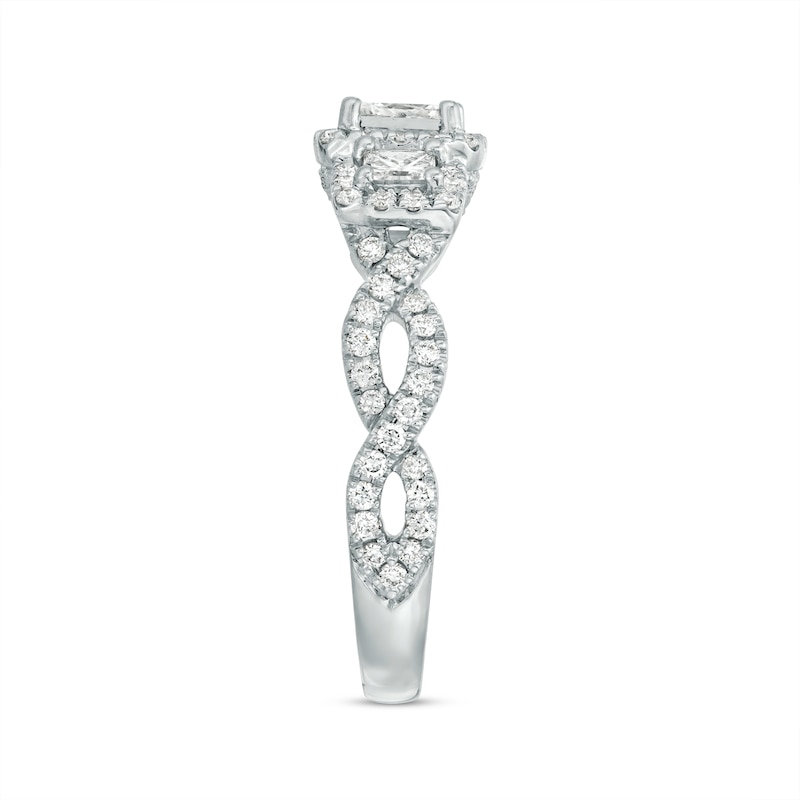 This sensational engagement ring from Neil Lane Bridal® showcases three dazzling princess-cut diamonds haloed by smaller round diamonds. Twists of diamonds adorn the 14K white gold band, bringing the total diamond weight to 1 1/8 carats.