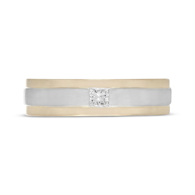 This brilliantly bold diamond wedding band from the Neil Lane® collection and features a magnificent square-cut diamond at the center of the 14K white gold band. In stunning contrast, the center is framed with sweeps of 14K yellow gold accents. The ring has a total diamond weight of 1/6 carat.