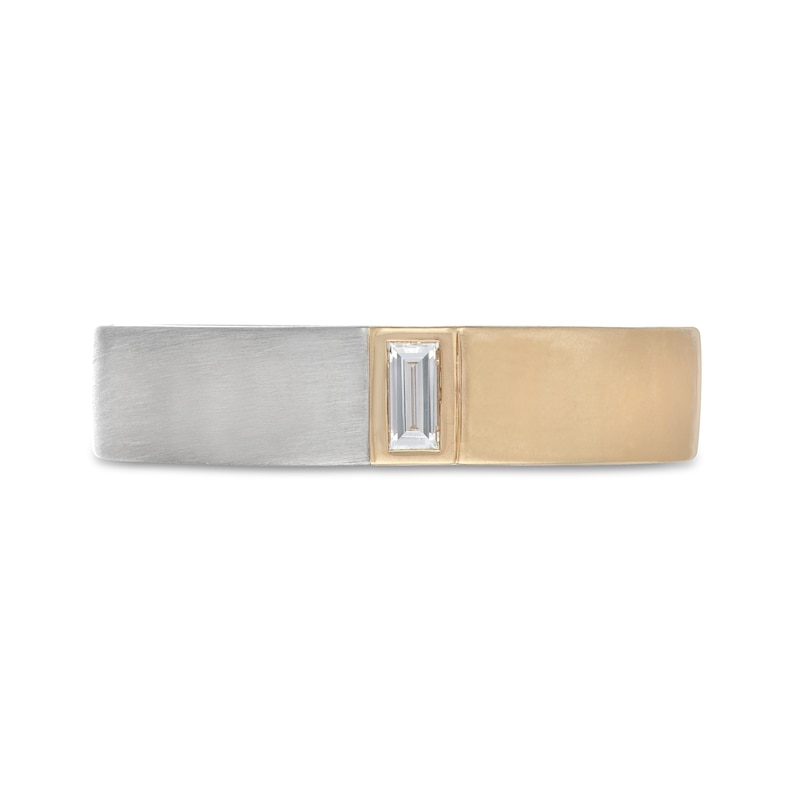 This brilliantly bold diamond wedding band from the Neil Lane® collection is styled in complementary combination. A magnificent baguette-cut diamond is set in a band of 14K yellow gold. In stunning contrast, the rest of the distinguished setting is crafted in iconic 14K white gold. The ring has a total diamond weight of 1/8 carat.