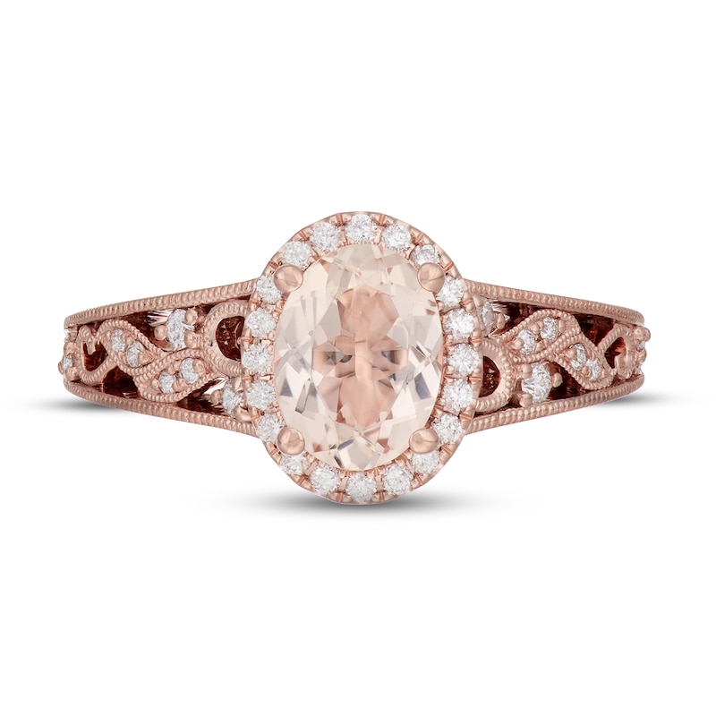 A gorgeous oval-cut morganite shines at the center of this beautiful tonal engagement ring. Set in dreamy 14K rose gold, the center gemstone is haloed by brilliant round diamonds. Beautiful milgrain detailing and more round diamonds gleam down the band for a total diamond weight of 1/3 carat. From the Neil Lane Bridal® collection.
