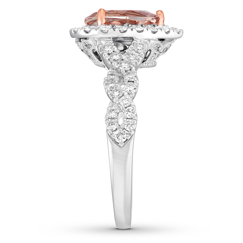 Elegance and romance come together in this remarkable engagement ring from Neil Lane Studio. The pear-shaped morganite center is elevated with sparkling round diamonds that twist along the 14K white gold band, bringing the total diamond weight to 3/4 carat.