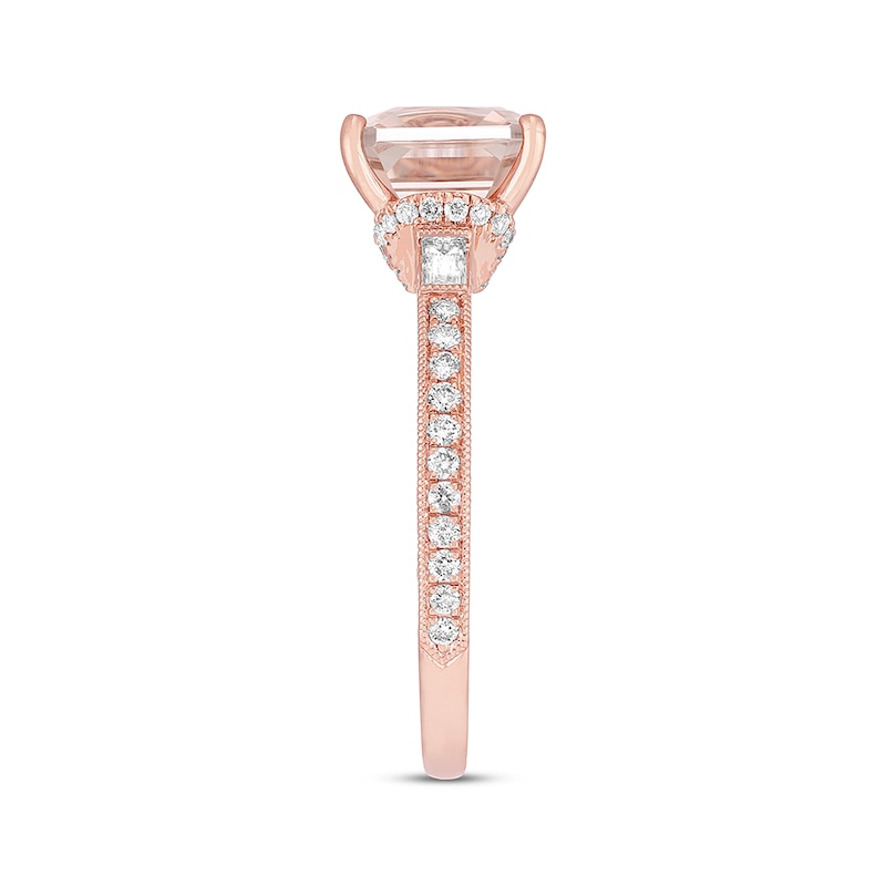 Vintage-inspired details blend perfectly with modern design in this incredible Neil Lane™ Studio engagement ring. An exquisite square-emerald cut morganite is the center of attention, while round diamonds wrap around the base of the setting to complement. The band displays baguette and round diamonds for an Art Deco look. Milgrain detail and carved flourishes add the finishing touch to the 14K rose gold band. The ring has a total diamond weight of 3/8 carat.