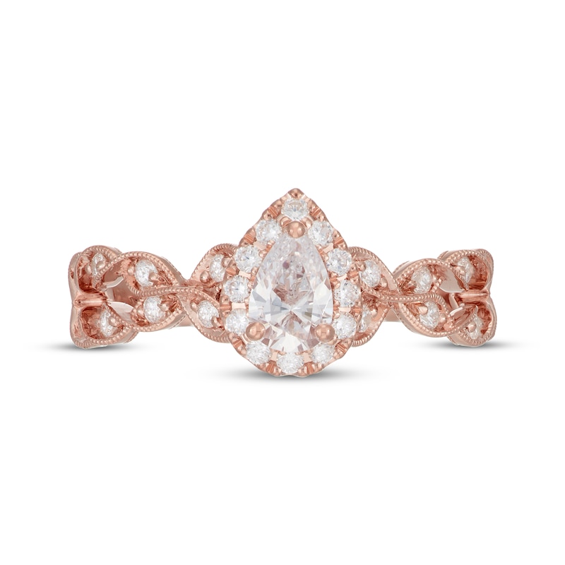 Vintage-inspired details create the perfect design in this incredible engagement ring from the Neil Lane Bridal® collection. A 1/3-carat pear-shaped diamond shimmers within a halo frame of round diamonds. The twisting split shank—decorated with round diamonds in marquise-shaped frames and milgrain details—gives the ring its heirloom style. Crafted in 14K rose gold, this ring has a total diamond weight of 5/8 carat.
