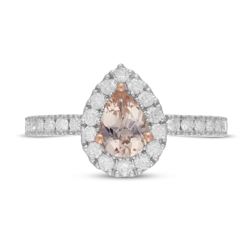 From the Neil Lane Bridal® collection, this entrancing engagement ring features a striking center pear-shaped morganite that is hugged with lovely round diamonds around the edges. Sparkling round diamonds continue to grace the 14K two-tone rose and white gold band to give the ring a total diamond weight of 5/8 carat.