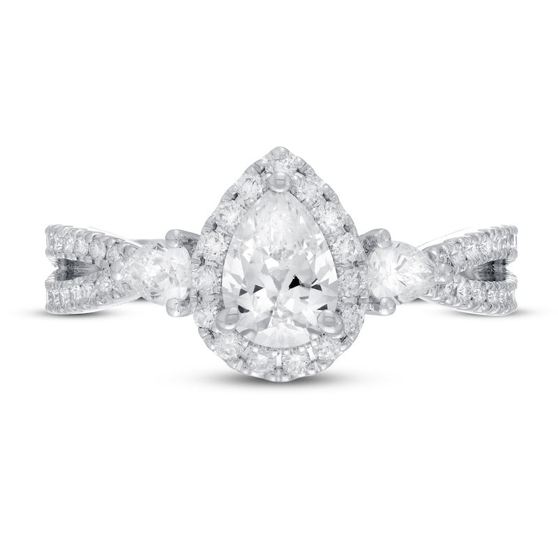 A gorgeous 3/4 carat independently-certified pear-shaped diamond sparkles at the center of this Neil Lane Premiere™ engagement ring for her. A halo of brilliant round-cut diamonds frames the center, and pear-shaped diamonds flank each side. More round-cut diamonds dance down each side of the band in two rows, giving the ring a total diamond weight of 1 3/8 carats. The 14K white gold ring features independently-certified diamonds and milgrain detailing to finish the look.