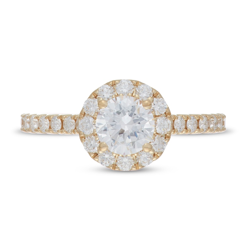 From the Neil Lane™ Premiere collection, this exquisite engagement ring features a spectacular design brought to life with independently certified diamonds. Shimmering round diamonds embellish the beautiful 14K yellow gold band and halo the luxurious round-cut center diamond. The ring has a total diamond weight of 1-3/8 carats.