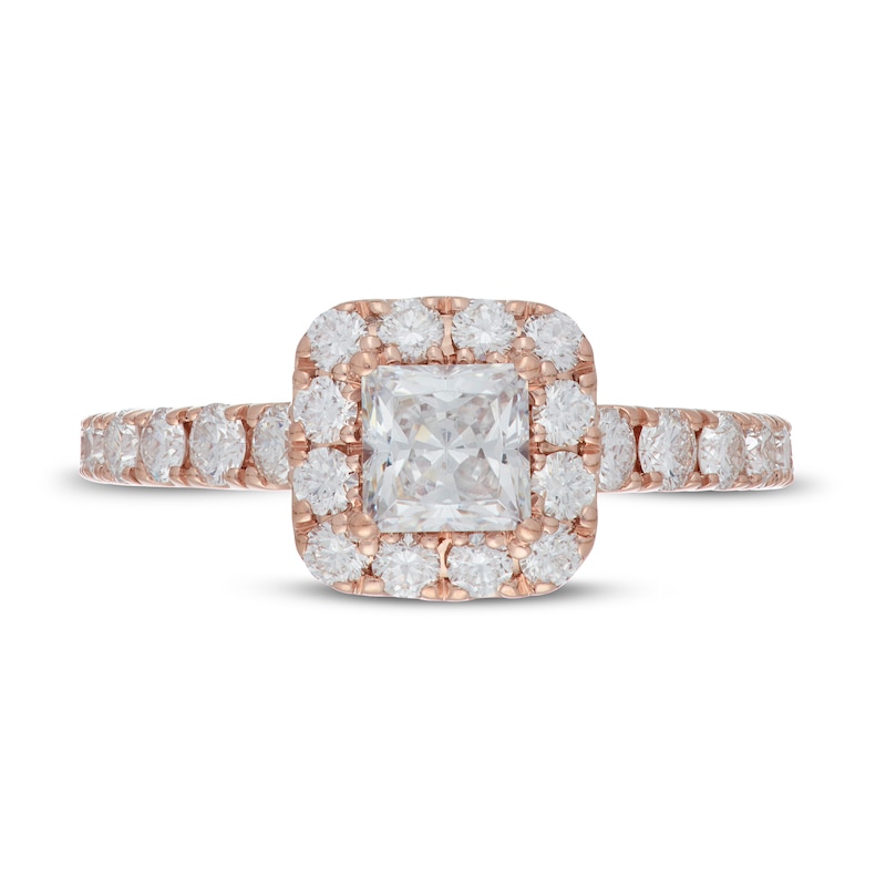 Neil Lane's elegantly modern designs are taken to a new level of glamour with independently certified diamonds in the Neil Lane™ Premiere collection. This incredible ring showcases a 3/4-carat princess-cut diamond wrapped in a brilliant halo of round diamonds. More fiery round diamonds grace the 14K rose gold band, bringing the total diamond weight to 1 5/8 carats.